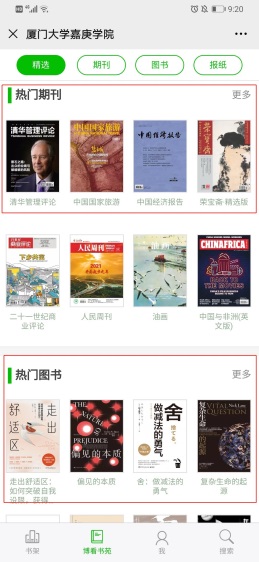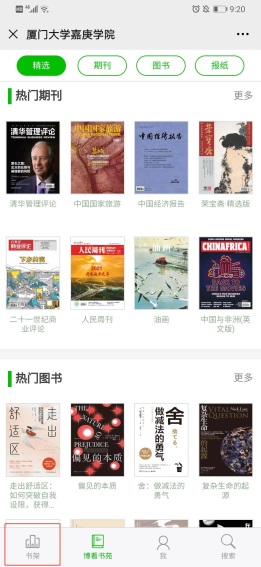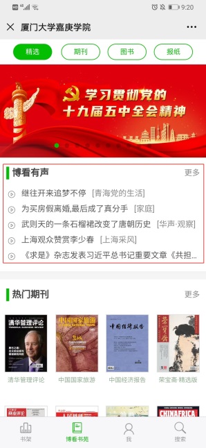 划个重点:目前“博看微刊”已与厦门大学嘉庚学院图书馆微信公众平台直接嵌入对接,无需另行下载客户端!