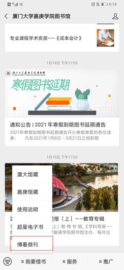 打开厦门大学嘉庚学院图书馆微信公众号—菜单栏我要借书—博看微刊