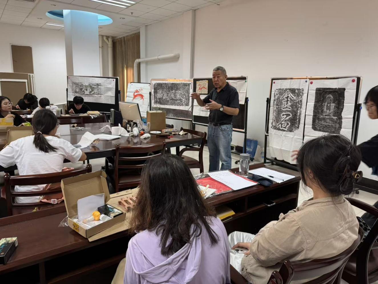 课程伊始,王占北老师结合自身研习拓片的经历,向同学们展示了多幅风格各异的拓印佳作,细腻的纹理与古朴的韵味瞬间点燃了同学们的兴趣。随后,他系统讲解了拓印的基本原理与操作流程,从印纸、塑料薄膜、纹理底板等工具的选择,到蒙纸、刷水、固定等基础技巧,再到上墨时的力度与均匀度控制,逐一细致演示,帮助零基础的同学快速掌握要领。