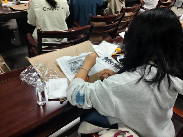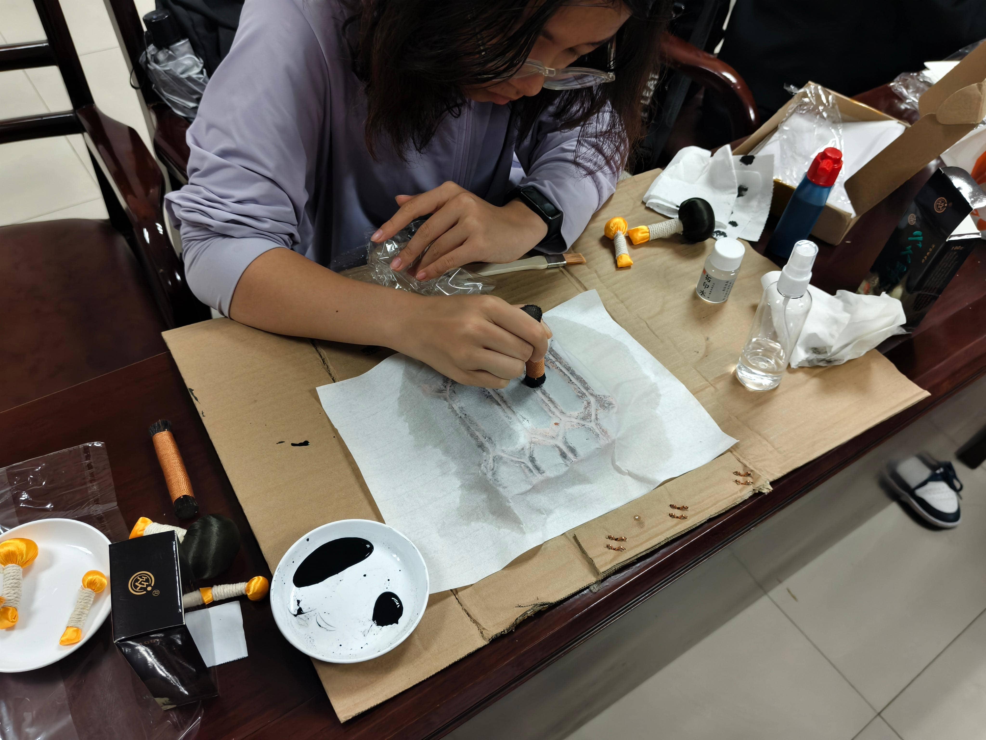 实践环节成为课程的高潮。同学们认真投入,逐步体验拓印全过程:先将空白印纸覆盖于纹理底板上,用刷子轻刷清水使其贴合;随后覆上塑料薄膜反复拍打,让纹理清晰转印于纸面;待纸张稍干,再用墨具均匀施墨,原本素净的纸面上逐渐浮现出细腻的纹样与图案。现场工具轻响,交流不断,大家在一按一拍、一涂一抹之间,体会到传统技艺的精妙与亲手创作的乐趣。
