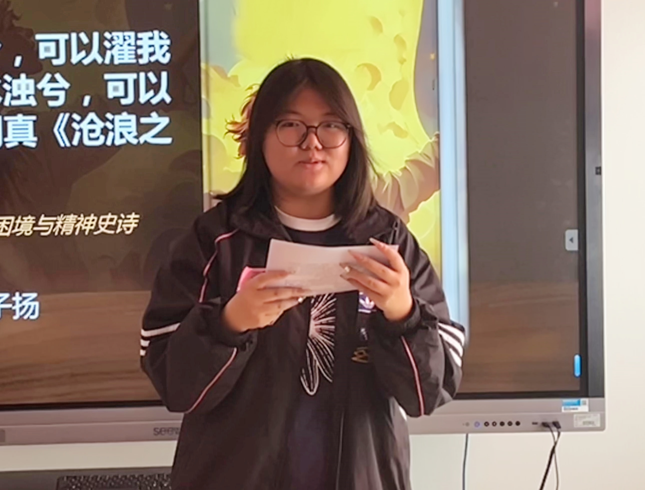 人文与传播学院的刘子扬分享了《沧浪之水》。她从屈原“沧浪之水清兮,可以濯我缨;沧浪之水浊兮,可以濯我足”的千古名句切入,探讨了主人公池大为在理想与现实之间的艰难抉择。她认为,这部作品如同一面镜子,映照出当代青年在成长过程中面临的普遍困惑与价值选择。