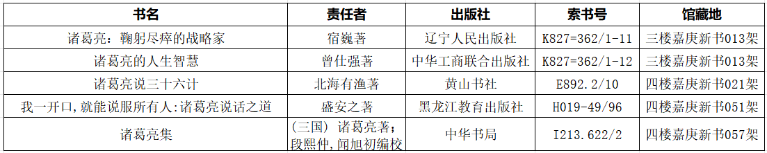 看完此篇满满干货的历史人物冷知识,你是否还想了解诸葛亮更多的历史知识,图书馆为大家准备了“诸葛亮”人物主题的图书合集,欢迎到馆借阅哦。推荐书目馆藏信息如下: