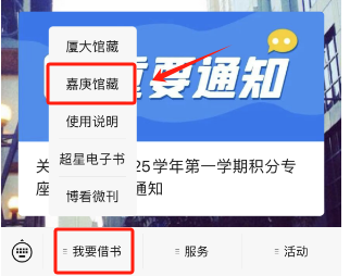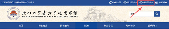 1. 通过图书馆网站或者微信公众号登录嘉庚馆藏“我的图书馆”。
