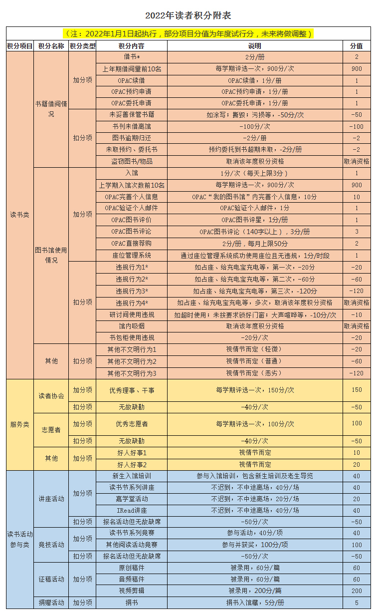 2. 每位读者起始分为100分,在此基础上按项目分值表(见附表)加减分。